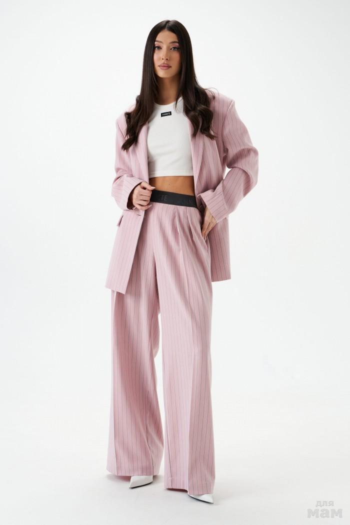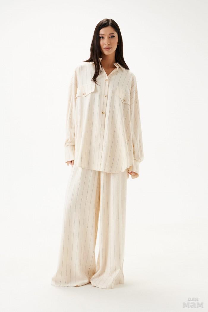 Брюки прямого свободного кроя. Выполнены из костюмной ткани цвета капучино в тонкую полоску. Прямой свободный крой, пояс стабильный, по поясу нашиты шлевки. По передней части защипы. В боковых швах карманы. Заутюженные стрелки по передней и задней частям изделия. Длина 112 см