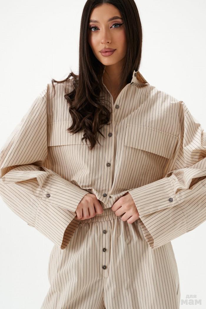 Рубашка прямого свободного кроя выполнена из текстильного полотная нежно-желтого цвета в полоску. Характеристики: прямой свободный крой, отложной воротник на стойке, застежка центральная на петли пуговицы, по переду крупные карманы, рукав спущен, по рукаву декоративные складки, по низу рукава широкая манжета, спинка отрезная с декоративными складками, низ изделия с плавным срезом.
