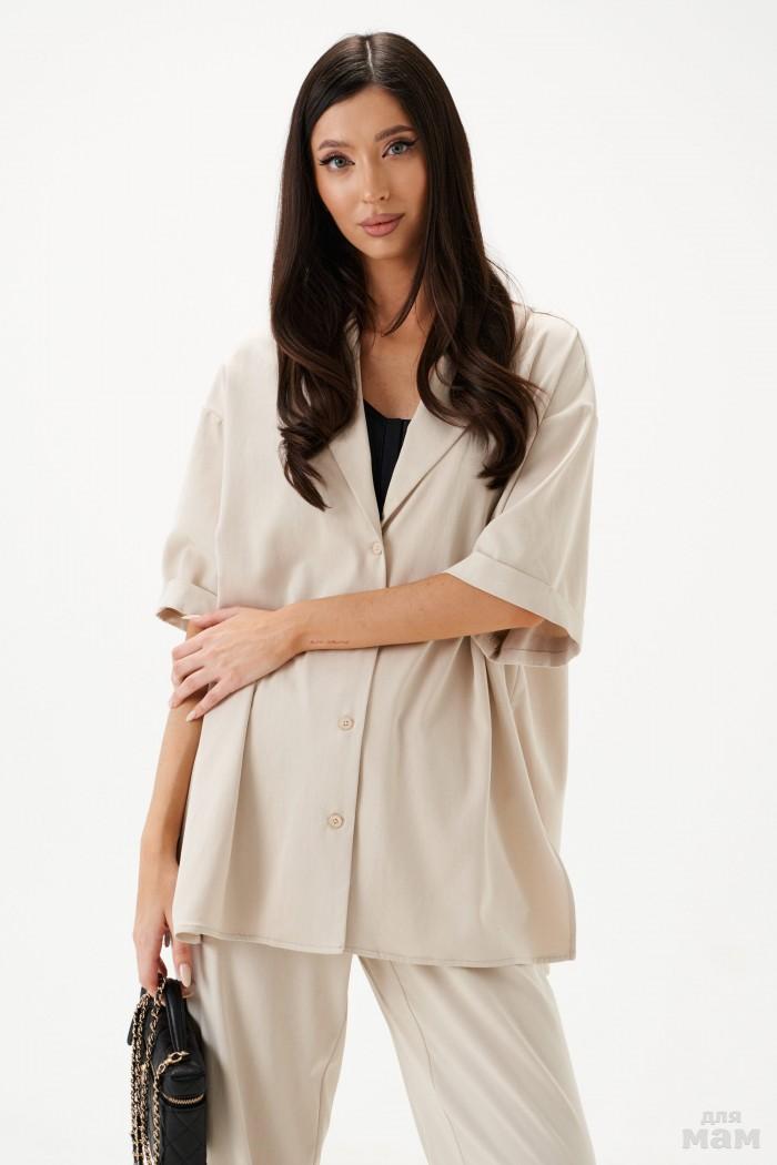 Рубашка прямого силуэта, свободного облегания из текстильного полотна молочного цвета. Воротник отложной на стойке.