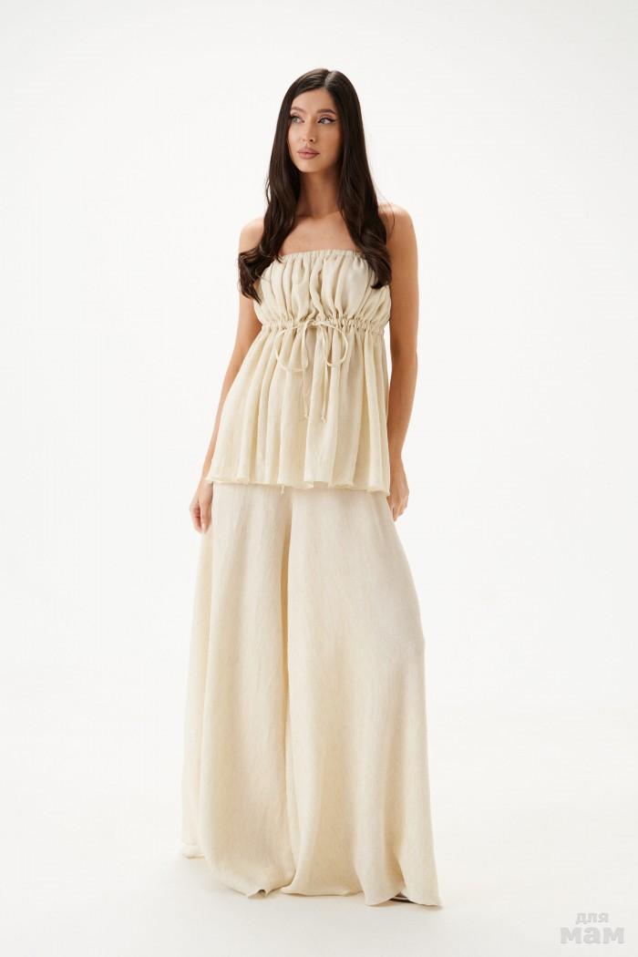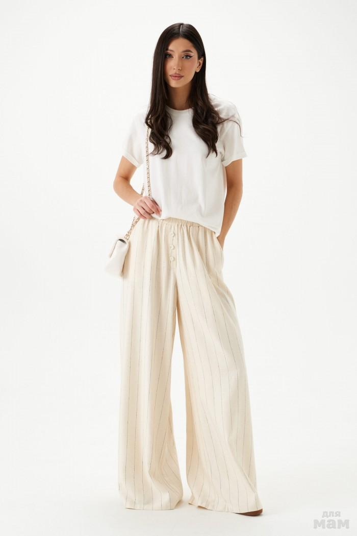 Брюки прямого свободного кроя. Выполнены из полотна цвета экрю. Пояс на резинке, заципы по переду, в боковых швах карманы, стрелки заутюжены. Длина по боковому шву 112 см.