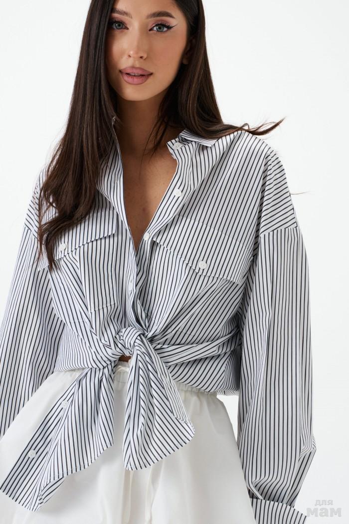 Рубашка прямого свободного кроя выполнена из тнкстильного полотная голубого цвета в полоску. Характеристики: прямой свободный крой, отложной воротник на стойке, застежка центральная на петли пуговицы, по переду крупные карманы, рукав спущен, по рукаву декоративные складки, по низу рукава широкая манжета, спинка отрезная с декоративными складками, низ изделия с плавным срезом.