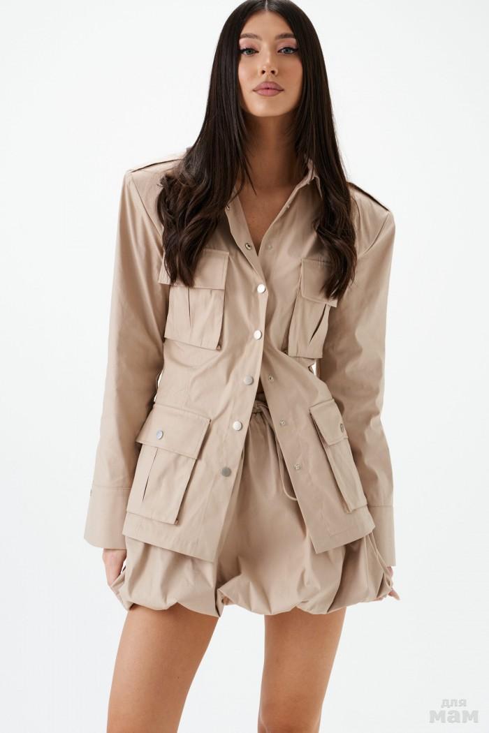 Блузка прямого свободного кроя выполнена из хлопка цвета хаки. Характеристики: Прямой крой, воротник пиджачного типа, функциональные накладные карманы по переду изделия, разрезы в боковых швах. Рукав втачной, немного спущен, по низу рукава широкий манжет. Длина по спинке 69 см, длина рукава от горловины 76 см
