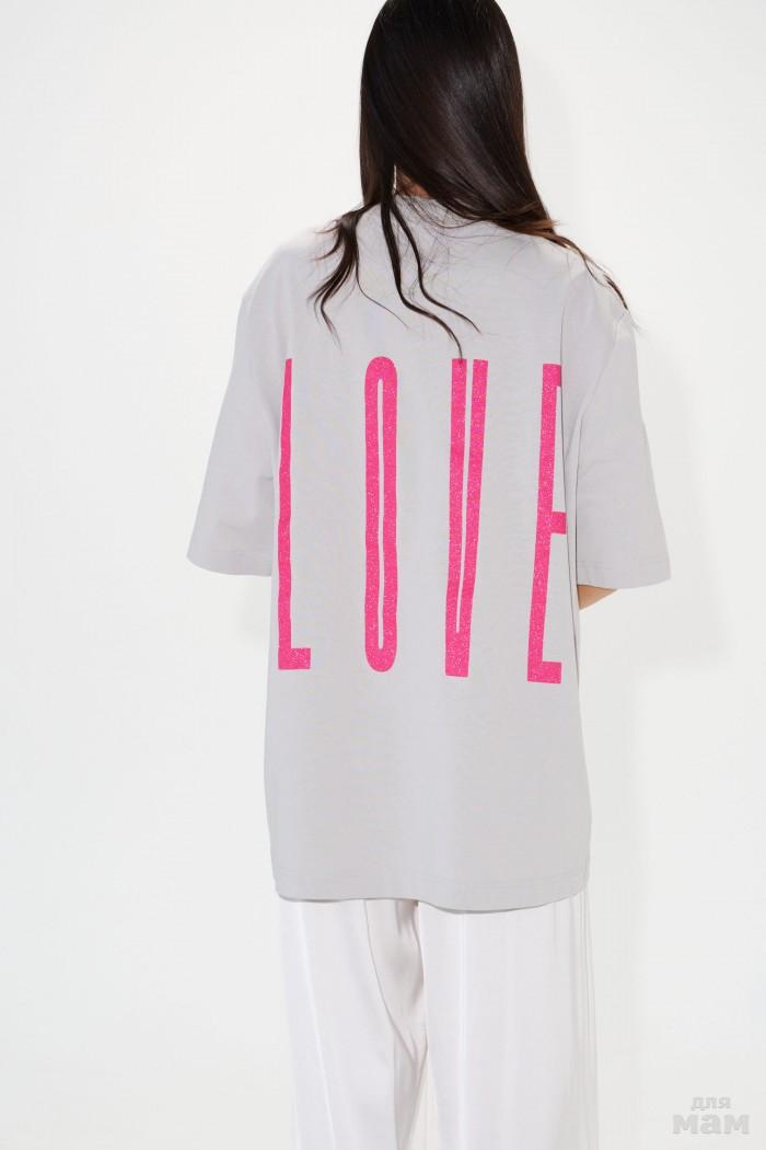 Футболка прямого кроя, выполнена из хлопкового полотная розового цвета. Характеристика: прямой свободный крой, горловина овальная, рукав слегка спущен, на спинке печать "LOVE" серебристого цвета. Длина по центру спинки от края горловины 75 см, длина рукава от края горловины 39 см.