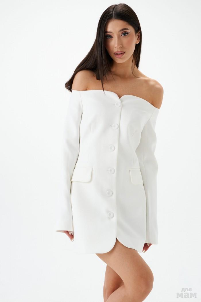 Жакет двубортный, полуприталленого силуэта. Выполнен из костюмной ткани белого цвета в полоску. Характеристика: отложной воротник с остроугольными геометрическими лацканами, вточной рукав, подклад, подплечники, талиевые выточки по переду, отрезной бочок, по переду изделия карманы-листочки талиевые вытачки по спинке. Длина рукава 24 см. Длина спинки от края горловины 72 см.