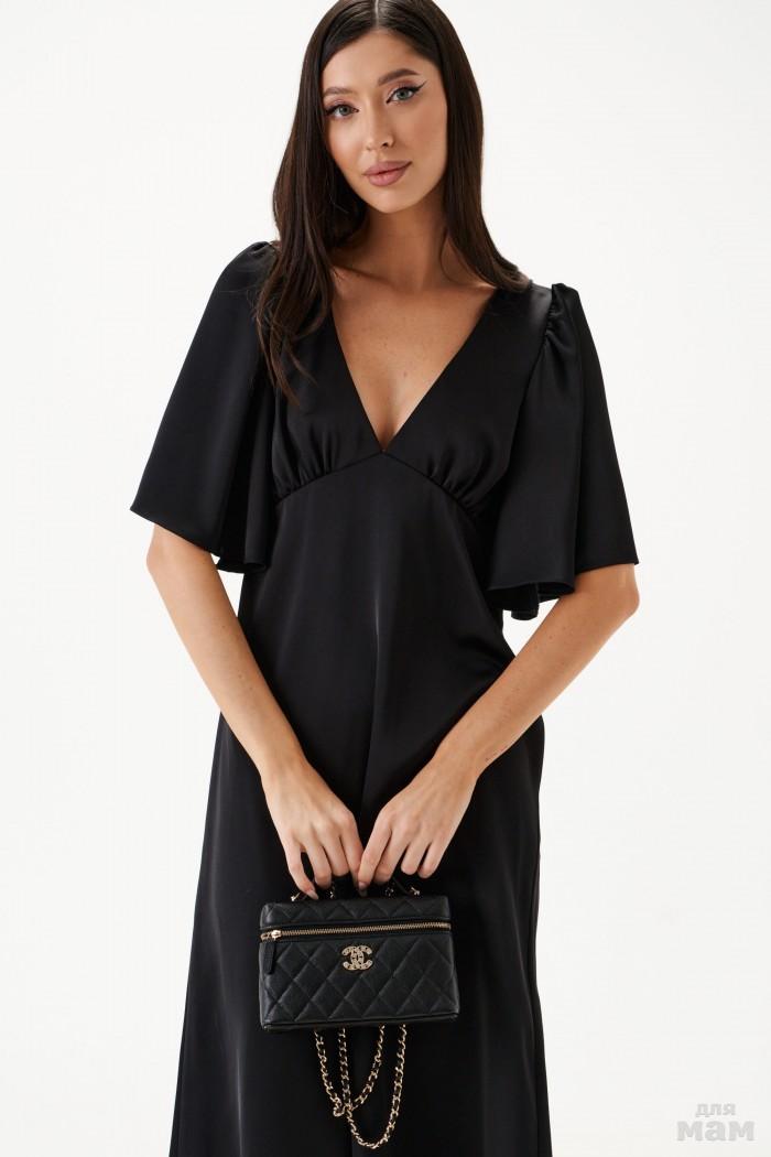 Платье полуоблегающегоо силуэта выполнено из черного полотна. Характеристики: полуоблегающий силуэт, расширенное к низу, цельнокраеная бритель через шею, спинка по верху присборена на резинку. Длина по боковому шву 110 см.