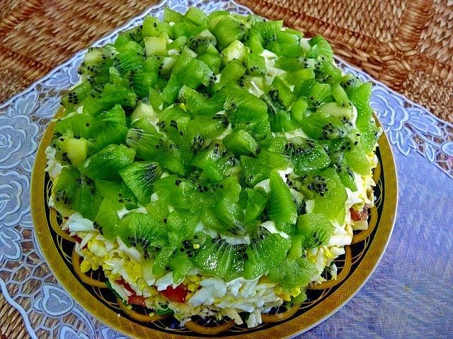 Ингредиенты: Куриное мясо - 400 грамм Лук репчатый - 1 штука Сыр твердый- 100 грамм Помидоры - 2 штуки Яйца - 4 штуки Киви - 3 штуки Майонез - 300 грамм Соль, перец - по вкусу Приготовление: Куриное филе сварить в подсоленной воде до готовности. Дать остыть и нарезать мелкими кусочками. Лук мелко нарезать. Сыр натереть на крупной терке. Помидоры нарезать небольшими кубиками. Яйца сварить в крутую, остудить в холодной воде, очистить от скорлупы и натереть на крупной терке. Киви очистить от кожуры и нарезать кусочками. Салат выкладывается слоями: куриное мясо, лук, смазать майонез, затем сыр, свежие помидоры, лук, смазать майонезом, яйца, майонез. Сверху выложить киви. 2. Салат "Первый снег"