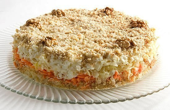 Ингредиенты: 4 картофеля 2 моркови 250 г свежей капусты 5 яиц 1 стакан грецких орехов 300 г майонеза Приготовление: Картофель и яйца сварить и очистить от кожуры. Картофель порезать небольшими кубиками. У отваренных яиц желтки отделить от белков и мелко порубить по отдельности или просто размять вилкой. Капусту тонко нашинковать, посолить, перемешать. Орехи поджарить, часто перемешивая, на сухой сковородке до светло-золотистого цвета. Остудить орехи и мелко порубить. Сырую морковь натереть на крупной тёрке. Салат выкладывается слоями: Картофель. Слегка подсаливаем и промазываем майонезом. Морковь. Опять подсаливаем и промазываем майонезом. Желток и майонез. Капуста, отжатая от сока. Майонез. Белки. Майонезом не смазываем. Орехи. Для более яркого вкуса в майонез можно добавить немного раздавленного чеснока. Дать салату несколько часов перед съедением настояться, пропитаться и охладиться. Резать и подавать, как торт. Приятного Аппетита!!!