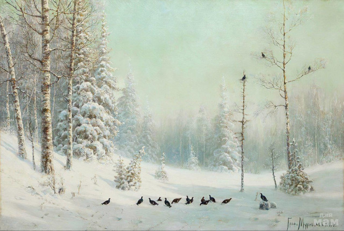 "Тетерева в зимнем лесу", 1913 г. Холст, масло. Муравьев Владимир Леонидович