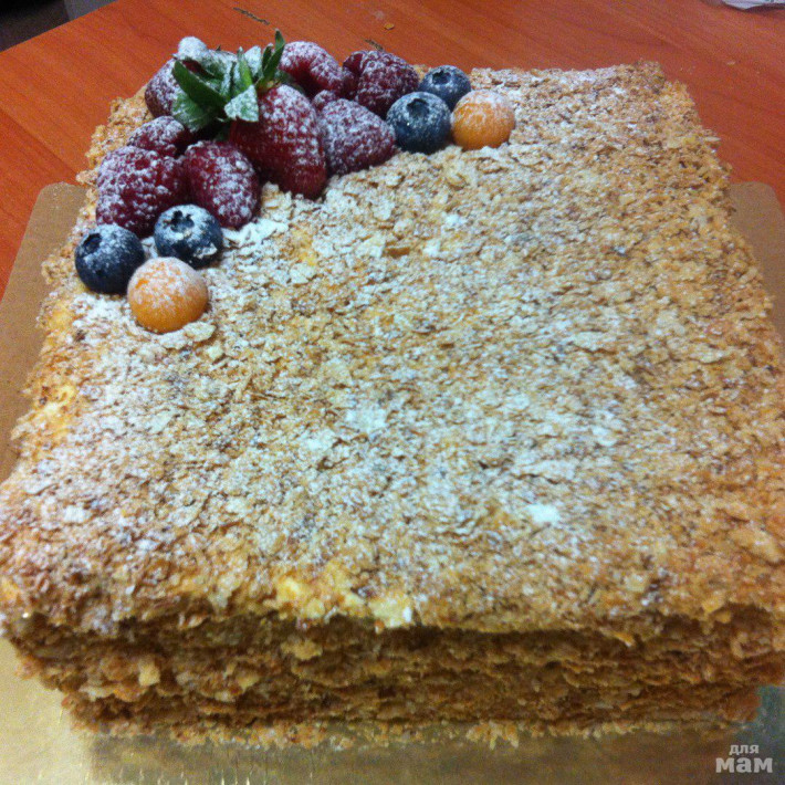 Торт "Наполеон" классический . Слоёные коржи ,заварной крем с семенами ванили .Украшен свежей ягодой . Вес 4 кг.
