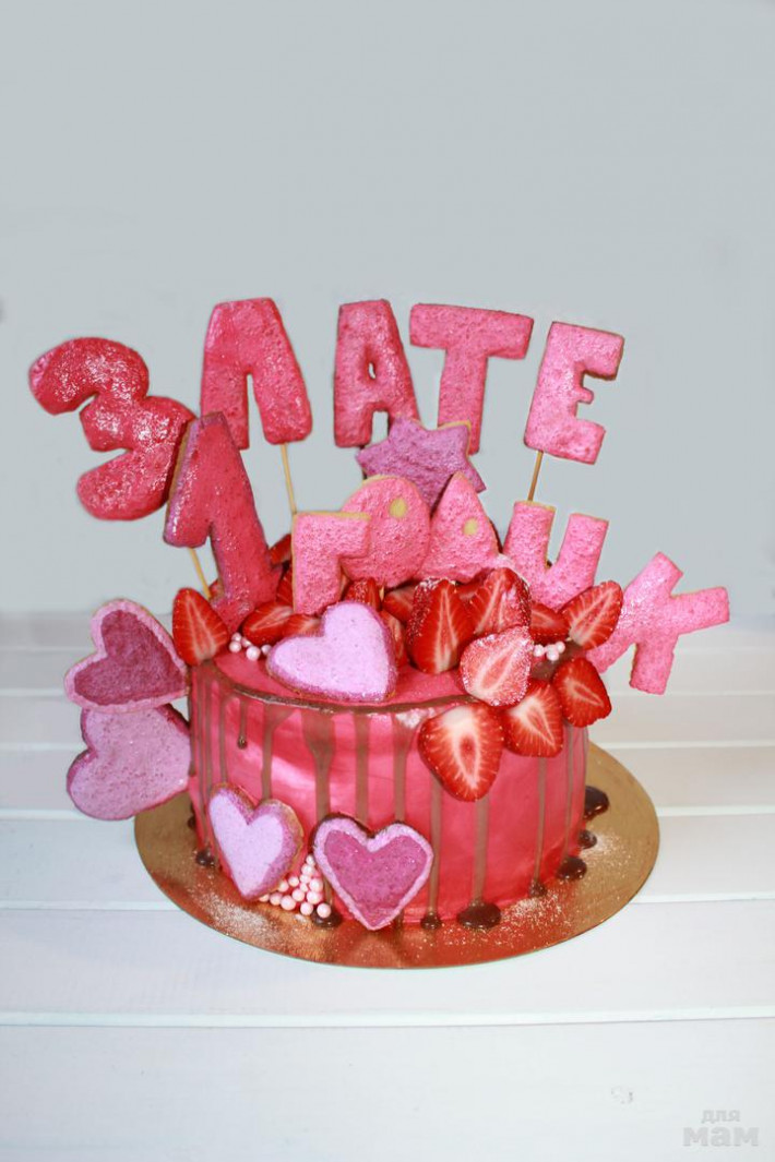Торт для девочки на День Рождения. Бисквиты Королевы Виктории, пропитанные карамельным сиропом, с начинкой из припущенной вишни внутри.