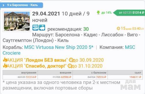 Но сейчас у MSC действительно неплохие условия для медиков, причём не только на одну какую-то страну, а для всего мира. Расчёт итоговой стоимости по этой акции происходит при отправке документов, подтверждающих медицинский статус, в круизную компанию.