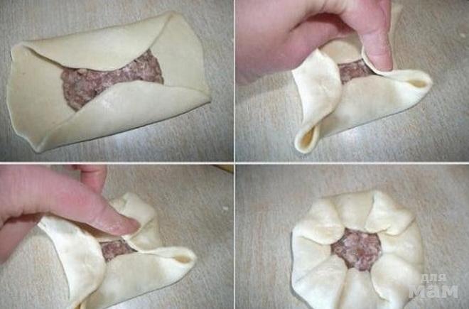 4. На каждую лепешку выложить столовую ложку фарша. Собрать края теста и слепить круглые беляшики, оставив в серединке небольшое отверстие.