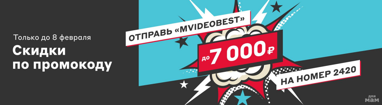 Только до 8 февраля отправь SMS со словом «MVIDEOBEST» на номер 2420 и получи промокод на скидку до 7 000 р. на бытовую технику, телевизоры, аксессуары, а также смартфоны, ноутбуки, компьютеры, размещённые на странице акции.