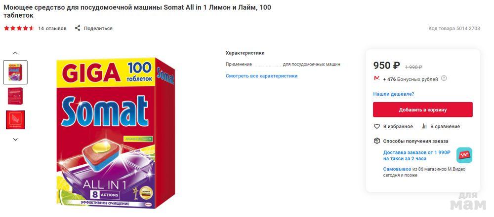 Таблетки для посудомоечной машины SOMAT All in 1 "Лимон и Лайм", 100 шт - 950 руб