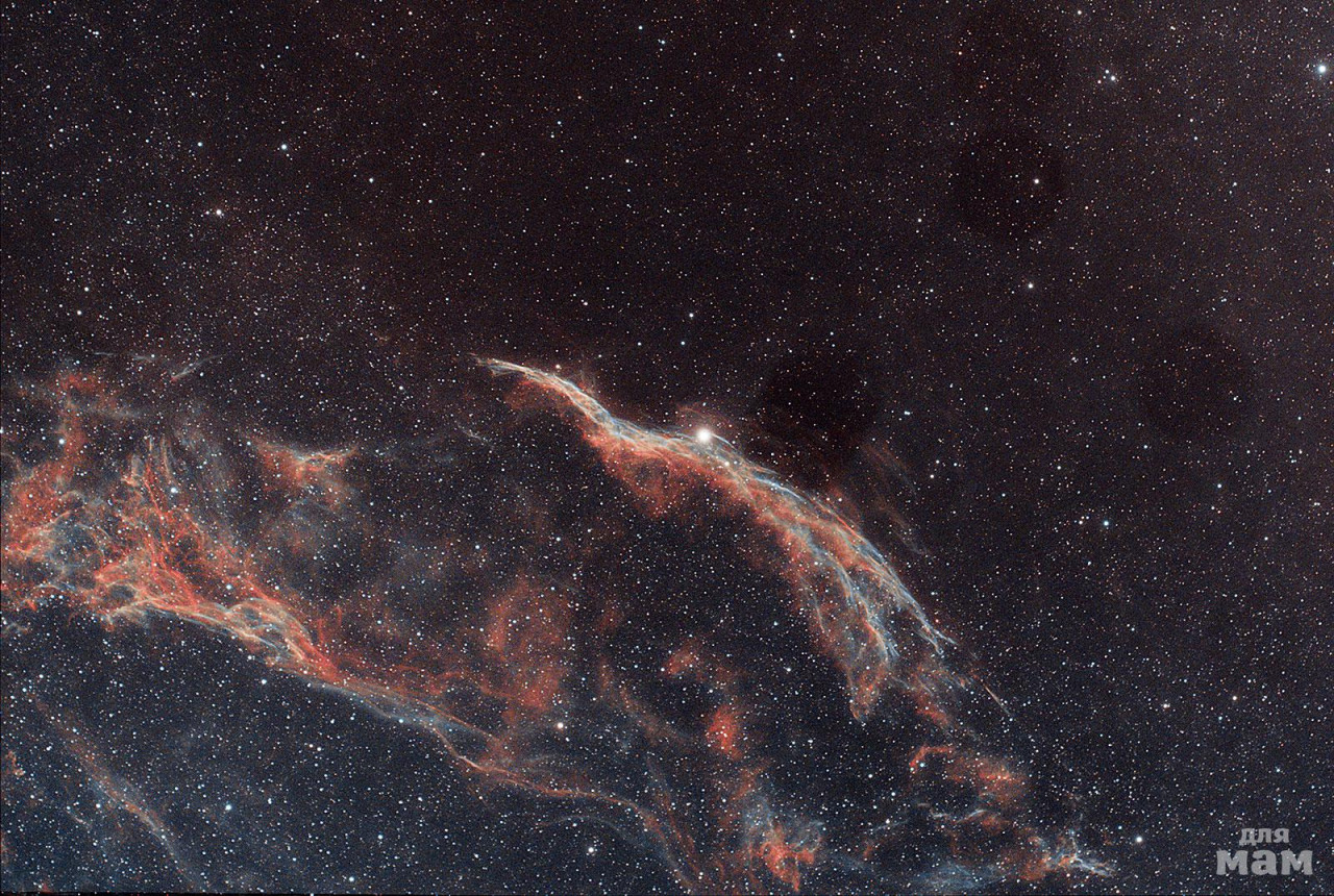 Туманность Вуаль (еще называют Петля или Рыбачья Сеть). Это остаток взрыва сверхновой звезды. Одна из красивейших туманностей. Тут немного капельки темные налипли на линзу, придется переснять.
