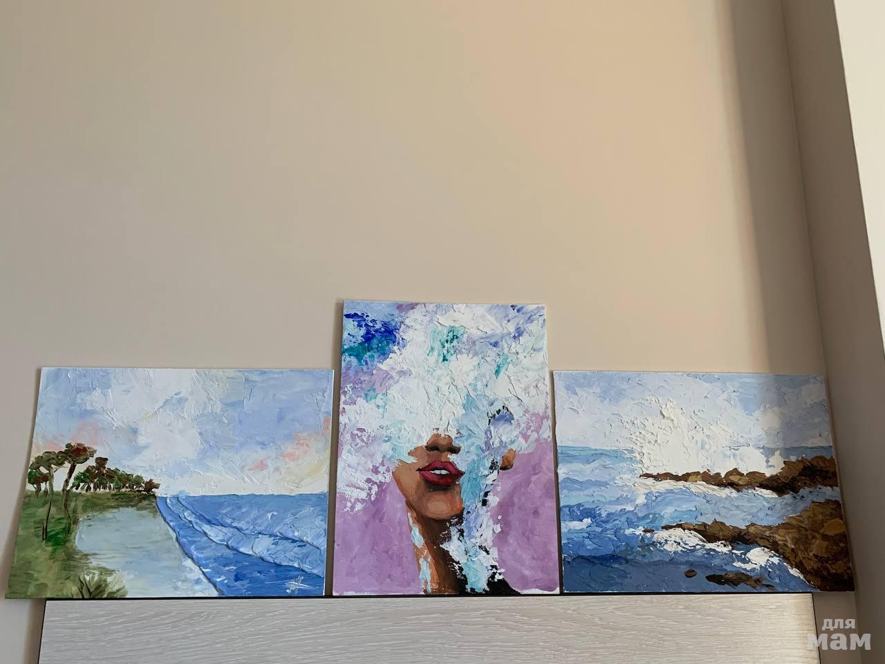 Дочка нарисовала, используя пасту и акрил. Рисовала на веранде, на свежем воздухе, с видами на море. Когда был ужасный ураган, дождь, гром, гроза, молнии. Все летало кругом. Поэтому многое не получилось.