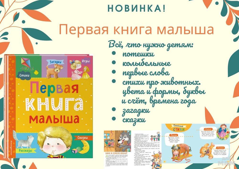 «Первая книга малыша» - кладезь художественной и познавательной литературы для детей от рождения до трёх лет. Развлечь самых маленьких народных потешки, загадки и простые игры, а убаюкать - колыбельные. Наглядные картинки позволят выучить первые слова. Детей постарше весёлые стихи познакомят с цветами, формами, буквами и цифрами, окружающим миром. Набор иллюстрированных сказок, рассказов про животных, стихов классиков (от Пушкина до Барто) поможет приобщить ребёнка к сокровищам русской литературы.