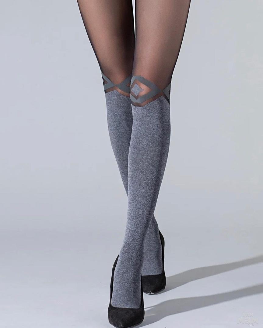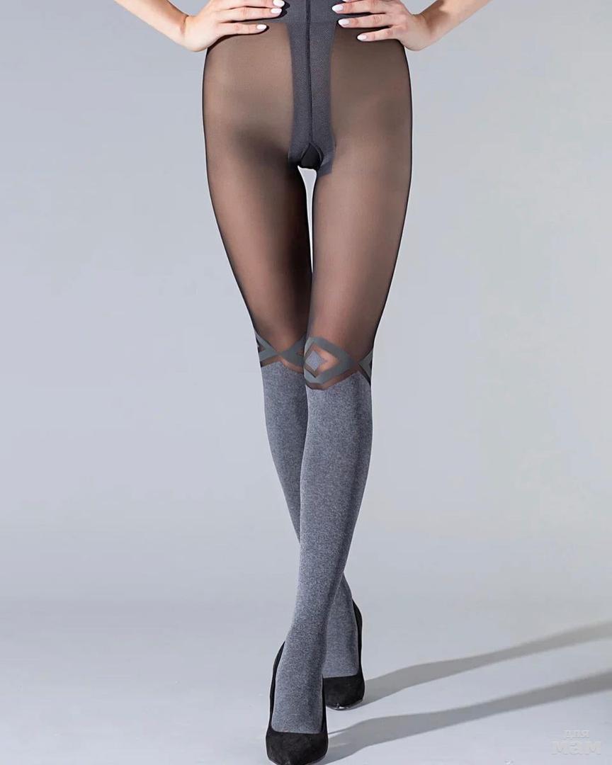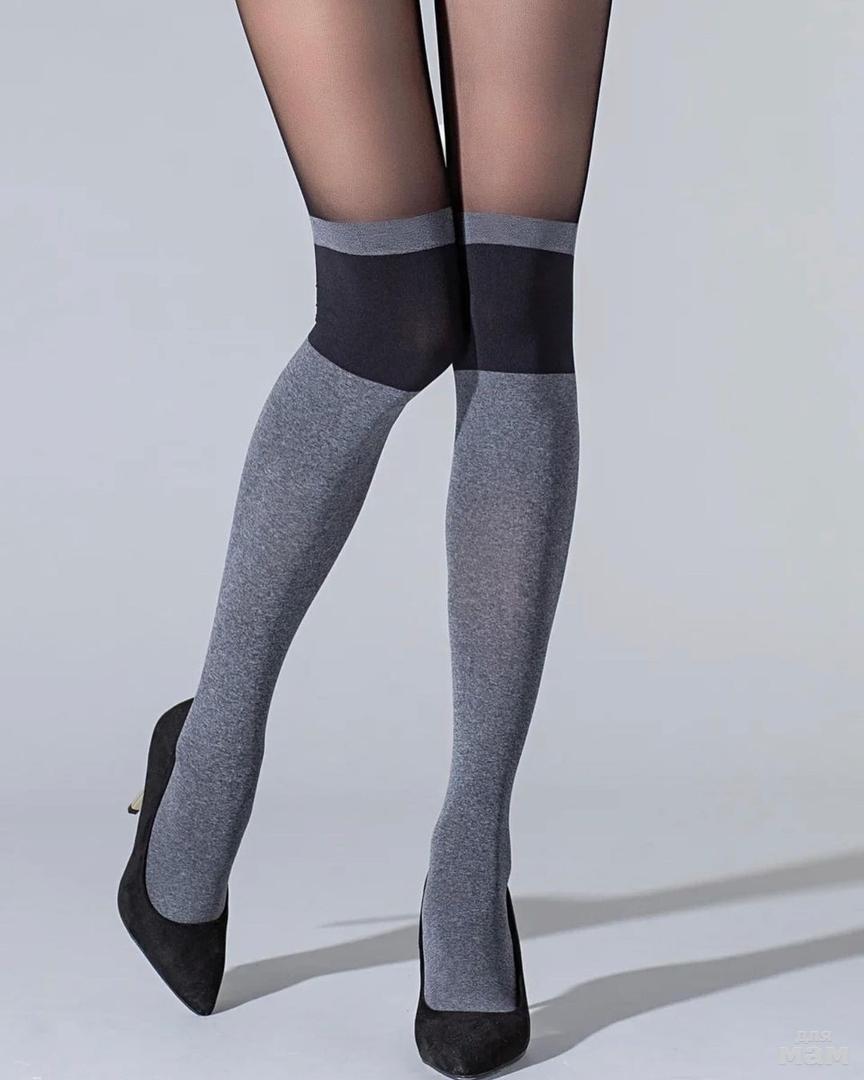 💫Новинки на JS-Company.ru: колготки с имитацией чулок. Тонкое, полупрозрачное плетение в области бедер сменяется плотными меланжевыми гольфинами матового серого цвета.