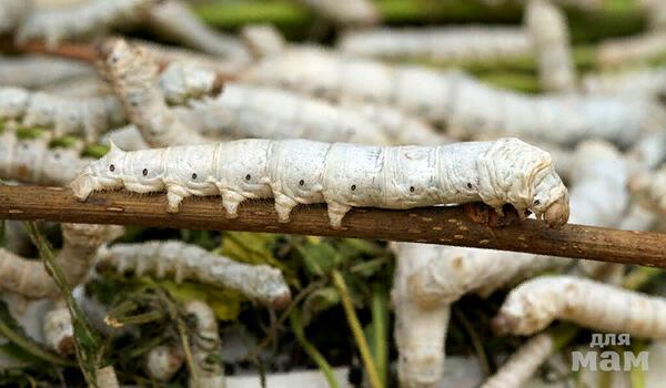 Появившаяся из яйца личинка очень мала, длиной всего около трех миллиметров. Но как только она начинает поедать листья тутового дерева, делая это непрерывно днем и ночью, она постепенно увеличивается в размерах. За несколько дней своей жизни личинка успевает пережить четыре линьки и превращается в итоге в очень красивую гусеницу жемчужного цвета. Длина ее тела около 8 см, толщина – около 1 см, и весит взрослая особь примерно 3-5 г. Голова гусеницы крупная, с двумя парами отлично развитых челюстей. Но главная ее особенность заключается в наличии специальных желез, заканчивающихся отверстием в ротовой полости, из которого она выпускает особую жидкость.