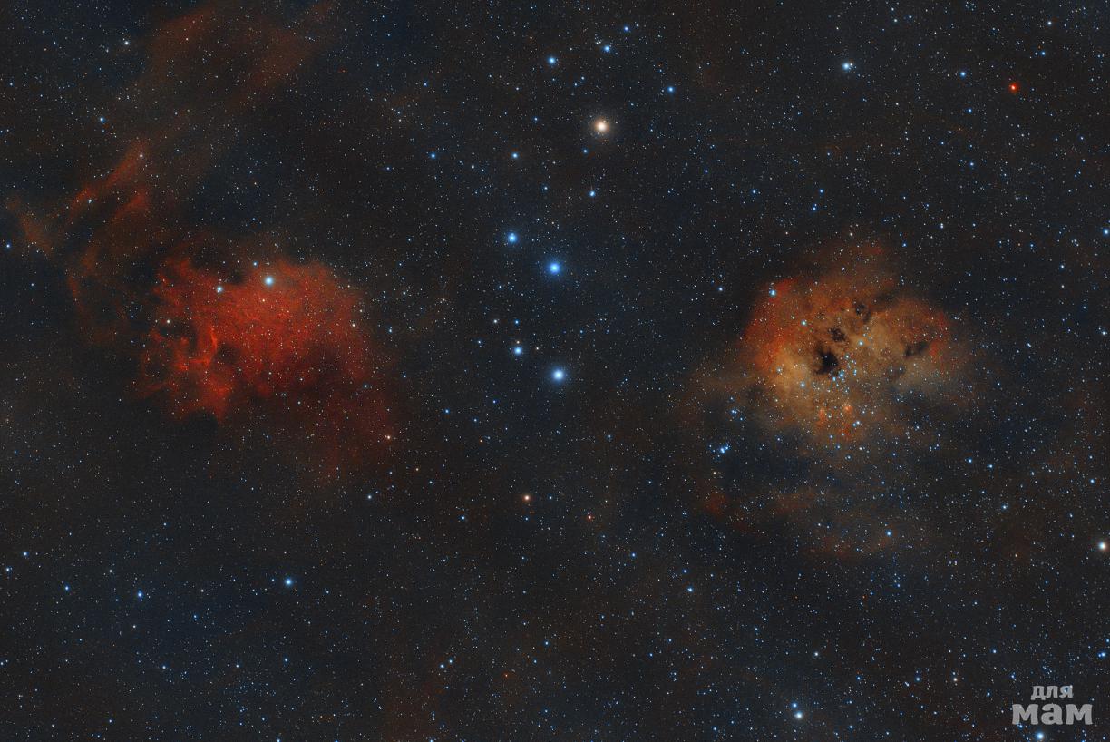 Очередной снимок от фанатеющего от астрономии супруга). Пламенеющая звезда и череп с головастиками (справа) - водородные туманности в созвездии Возничий, 14 тыс. световых лет с молодыми звездами, возрастом всего по 10 млн. лет.