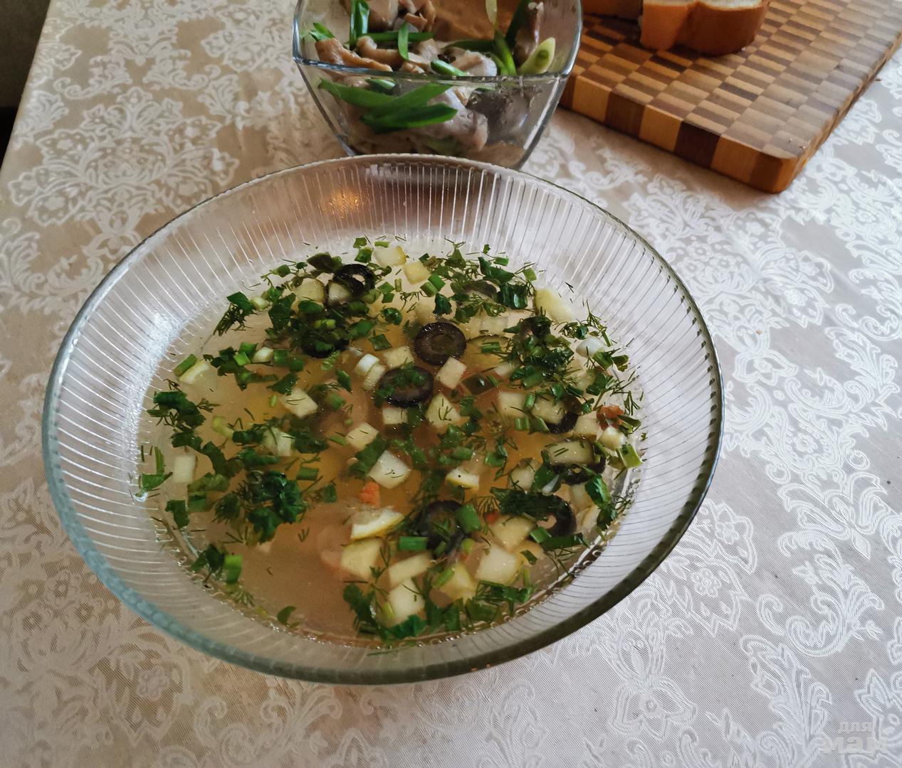 Его основа - бульон, оставшийся от варки языка. А наполнение - то, что осталось на тарелках из нарезки (копченая куриная грудка, ветчина, корейка и прочие подобные вкусности) и овощные закуски (соленые орурцы, оливки, маслины, лимон, зелень).