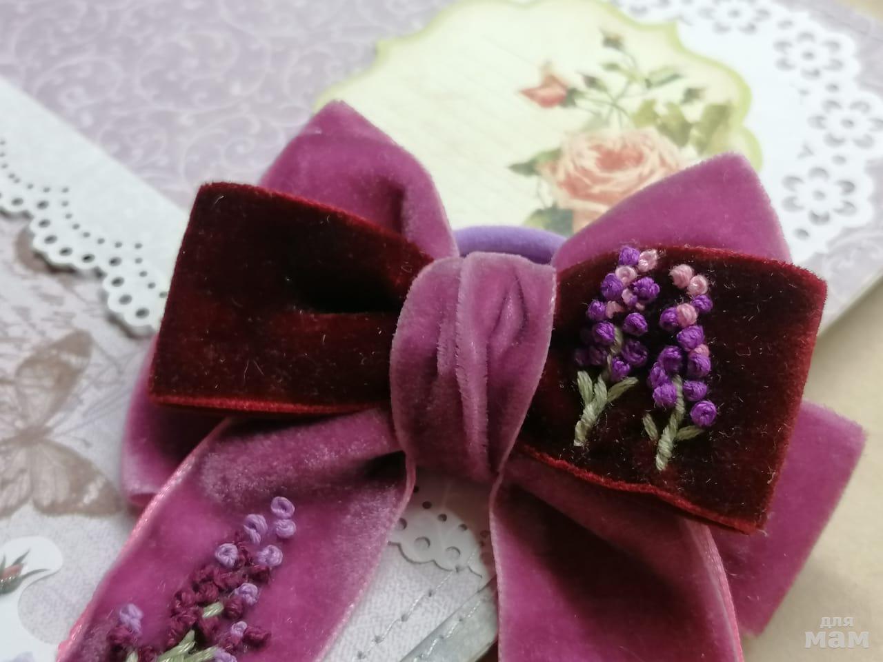 3) Нежная лаванда. Примерный размер 8х9см. Модель бантика универсальная и подойдет на любой возраст. Красивый цвет бархата подойдет и под бордовую форму.