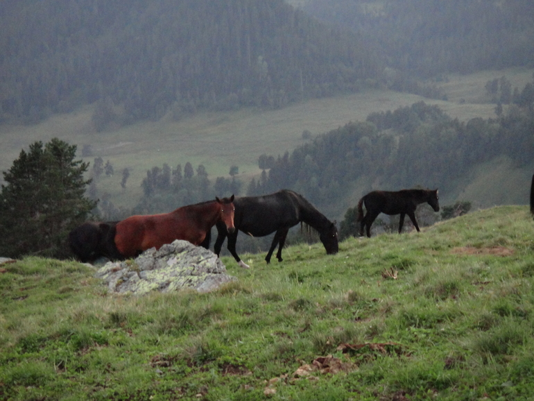 Переночевали. Ночью вокруг палатки ходили кони. Громко фыркали и звенели колокольчиками)) Сначала мы из пытались прогнать, но они упрямо возвращались и мешали спать))
