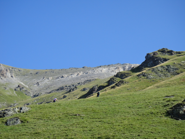 Распогодилось к обеду. Муж и кума решили пойти на перевал налегке. Самый трудный отрезок пути вот эта узенькая, очень крутая тропка: