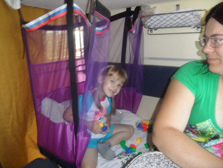 Ехали мы поездом до Новочеркасска. Дорога заняла чуть больше суток. Ехали в плацкарте, заняв 4 «купейных» места. Для дочери я сшила манеж для поезда по МК ббшки Елены Чуркиной. Очень удобная вещь!