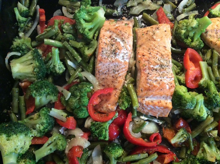 Приправить их солью и специями. На овощи положить семгу. И отправить в духовку разогретую до 180 гр на 30-35 минут, потом перемешать овощи и оставить еще на 7-10 минут при температуре 200 гр. и все блюдо готово.