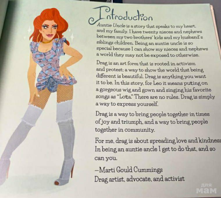 Скинул подписчик одного канала, а ему – родственник из Канады. Такую книжку там дают почитать детям в детском саду, она про «тётю-дядю». «Быть тётей-дядей – особенный опыт, потому что я могу показать моим племянникам и племянницам мир, который они сами никогда бы не увидели. Трансвестизм – форма искусства, основанная на активизме и протесте, способ показать миру, что быть другим – прекрасно. С трансвестизмом ты можешь быть чем угодно. Правил нет.» Дальше даже переводить не буду, дорогие друзья, пальцы не гнутся эту чушь набирать. Западная цивилизация культурно выродилась. Роскомнадзор, держи дверь.