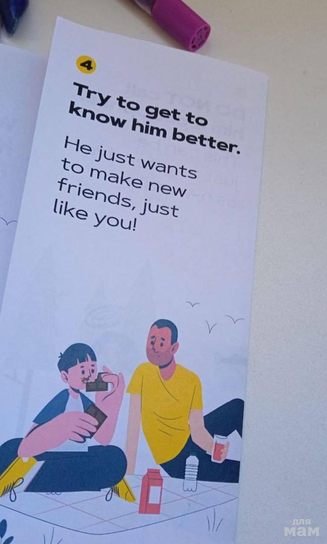 «Что делать, если к тебе подошел незнакомец на улице? Не надо его боятся, обычно он не сделает тебе ничего плохого. Не надо кричать и плакать, это может ранить чувства незнакомца. Не называй его педофилом, это слово ругательное. Попробуй узнать его лучше. Он просто хочет завести себе новых друзей, как ты. Пригласи его к себе. Ты не можешь себе представить каким весёлым может быть твой новый друг»