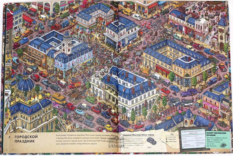 Скорее по следу неуловимого преступника через огромный музей, сквозь тысячи машин на городской площади, пробираясь через столпотворения в уличном кафе, на воздушных шарах по небу, взбираясь по лестницам все выше и выше на крыши города, плутая по лабиринтам старого замка, и забираясь на самые высокие деревья загадочной лесной деревни, сдерживая ужас плутать по дому вампира Дракулы, догонять Мистера Икса в порту и на железной дороге.