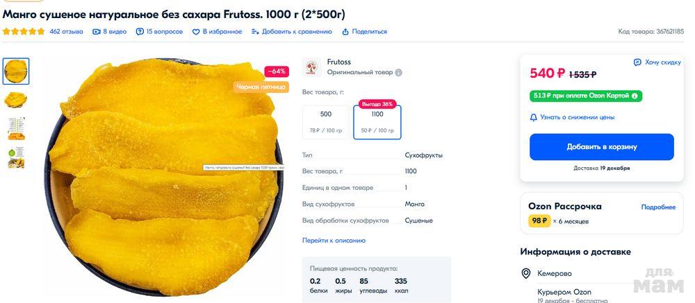 Манго сухое натуральное без сахара Frutoss. 1000 г https://vk.cc/cjptbi
