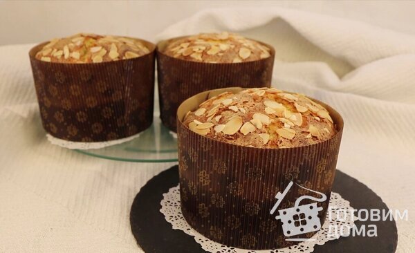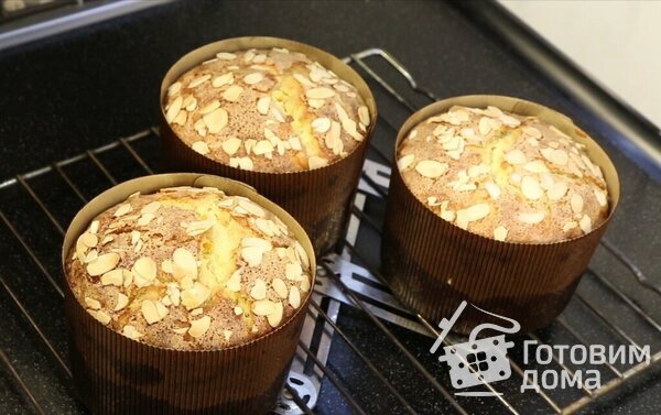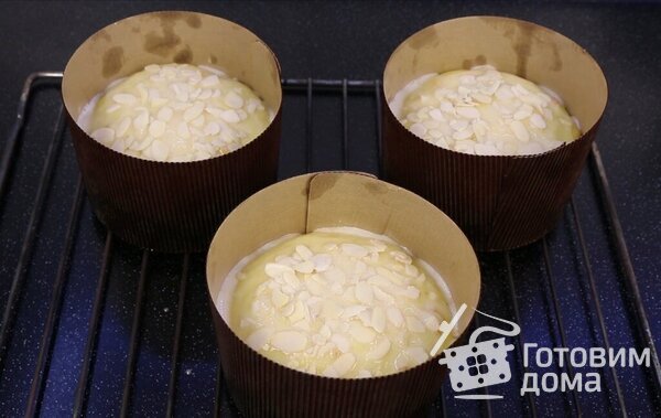 Аккуратно смазываю подошедшие куличи, присыпаю лепестками и отправляю в заранее разогретую духовку до 180 градусов. Сразу снижаю температуру до 160-165 градусов и выпекаю 35-40 минут до золотистой корочки.