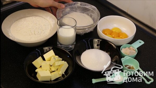 Тем временем в чаше комбаина соединяю муку, соль, специи, сахар, молоко с дрожжами, желтки и замешиваю 3 минуты на минимальной скорости.