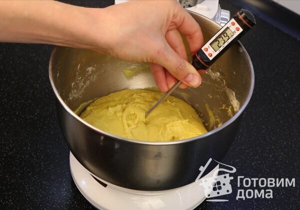 Вообще, главная сложность этого теста в том, чтобы не перегреть его. Нельзя чтобы температура теста повышалась выше 24 градусов. Проверяю, если нужно, отправляю в холодильник на 20 минут остыть, а затем продолжаю замес на 2-3 скорости на протяжении 10 минут.