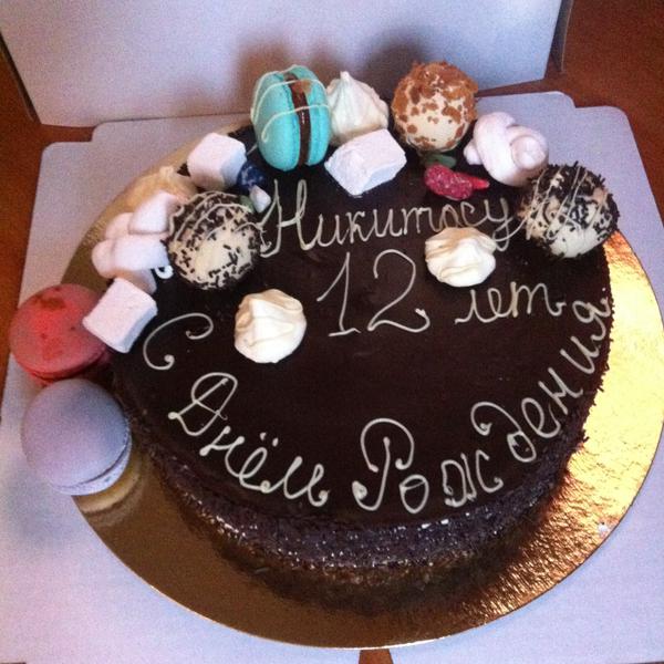 Птичье молоко на шоколадном бисквите,украшен макаронами,маршмеллоу,безе и шейк-болами Вес 1,8кг.