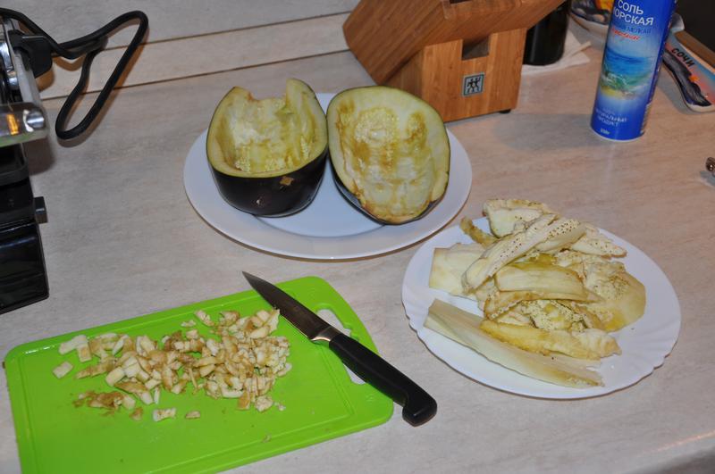 Баклажаны, которые стояли посыпанные солью и уже дали сок, промываем холодной водой и фаршируем ( кто-то добавляет немного майонеза, я не любитель)
