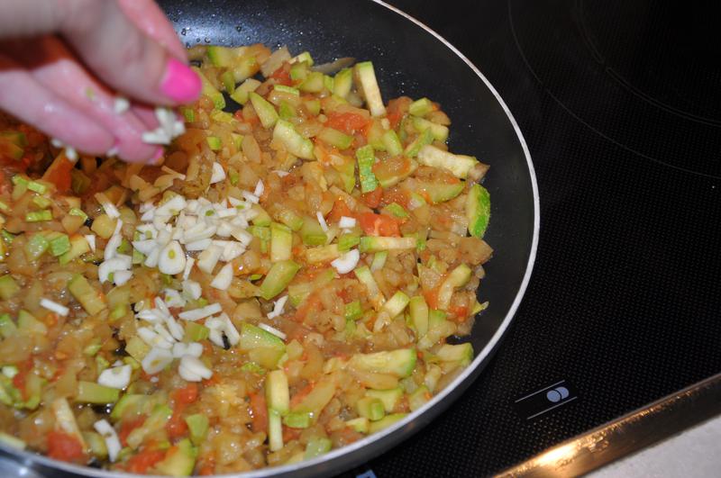 Отправляем все на сковородку, добавляем чеснок, солим и тушим до готовности