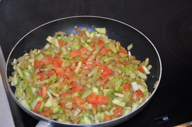 Добавляем кабачки, помидоры и еще тут, желательно, добавить ветчину ломтиками ( я в этот раз делала без нее, но с ней вкуснее)