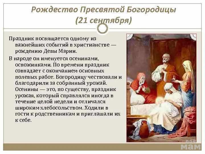 Сегодня православные верующие встречают Рождество Пресвятой Богородицы, дата праздника – 21 сентября (8 сентября по старому стилю). Он открывает начавшийся 14 сентября богослужебный год – цикл двунадесятых, то есть 12-и главных праздников Русской церкви, во время которых вспоминают главные события человеческой истории с точки зрения христианского вероучения. Завершается церковный год празднованием Успения Пресвятой Богородицы (28 августа).