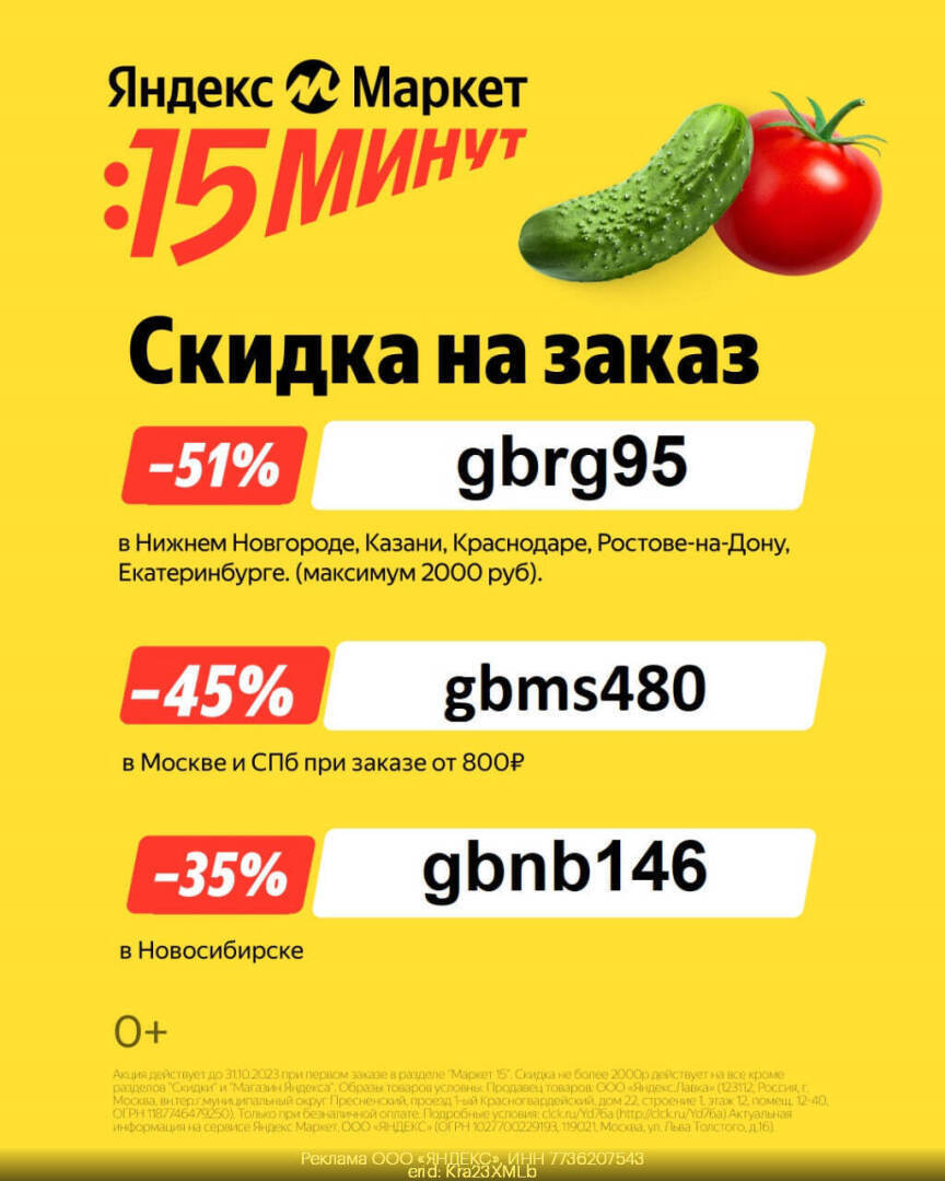 Учтите, что акция доступна только для новых клиентов из Новосибирска. Промокоды не суммируются с другими предложениями и не действуют на разделы "Скидки" и "Магазин Яндекса". Чтобы воспользоваться предложением, вам следует использовать мобильное приложение.