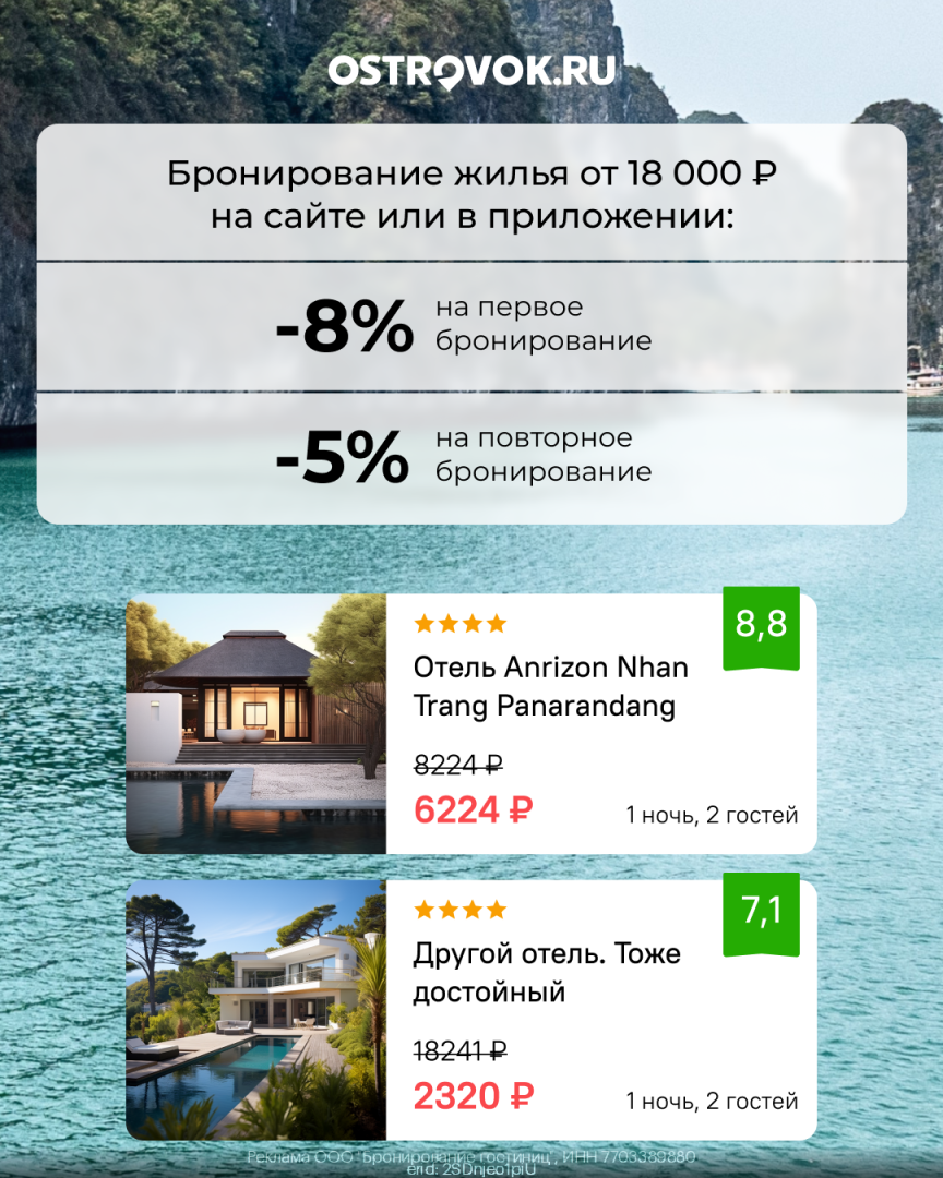 Путешествия начинаются не с выхода из дома, а с момента бронирования жилья. В этом вам поможет Ostrovok — сервис, который открывает двери в мир уютных апартаментов, роскошных отелей и уникальных домов по всей России. И сейчас у вас есть прекрасная возможность сэкономить на вашем следующем приключении!