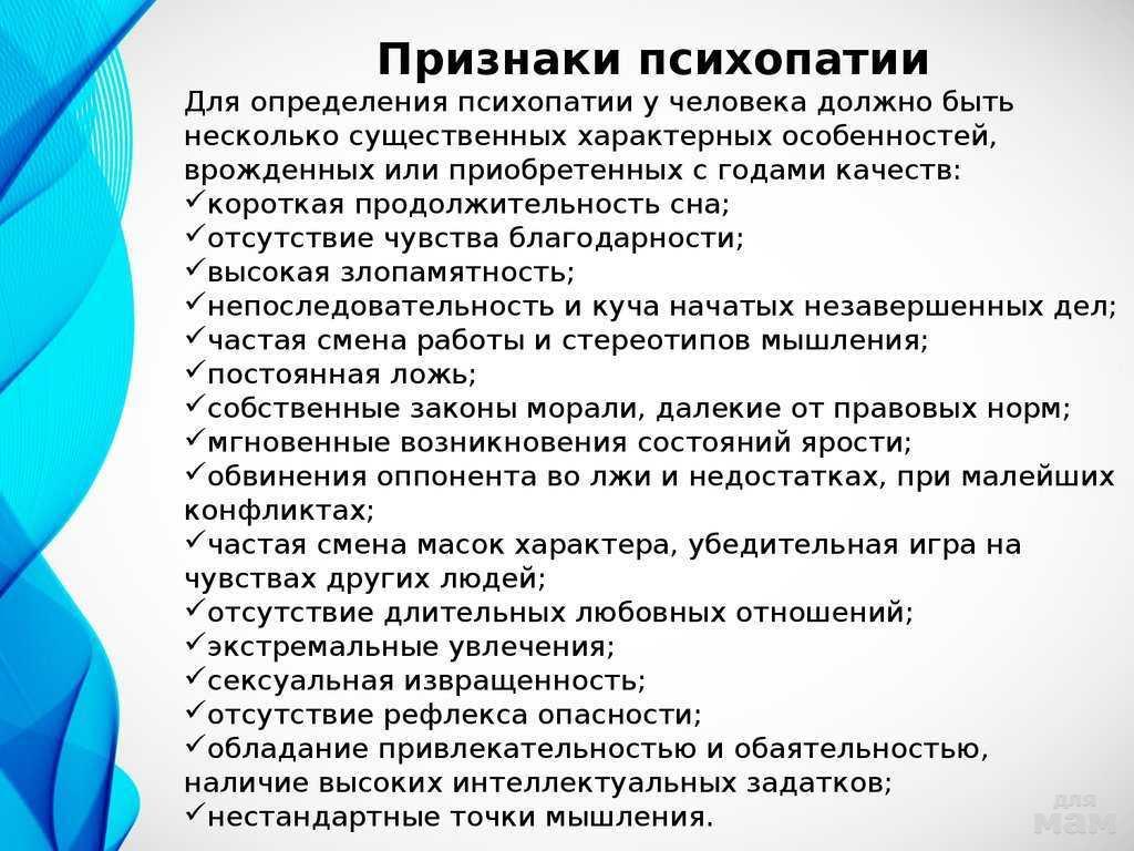 Психопатии клинически проявляются в патологических чертах характера, дисгармонии личности, нарушении эмоциональной и волевой деятельности, нарушении адаптации личности в обществе.