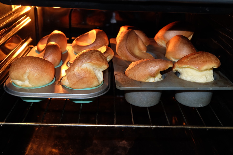 Вот только что я взбила два яйца, стакан муки, стакан молока, соль, сахар. И всёёёёё....даже никакого разрыхлителя тут не надо. Секрет в маленьких формочках и правильной температуре.