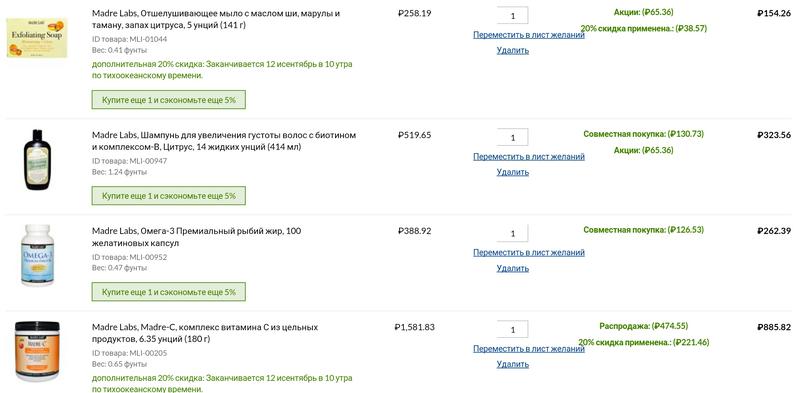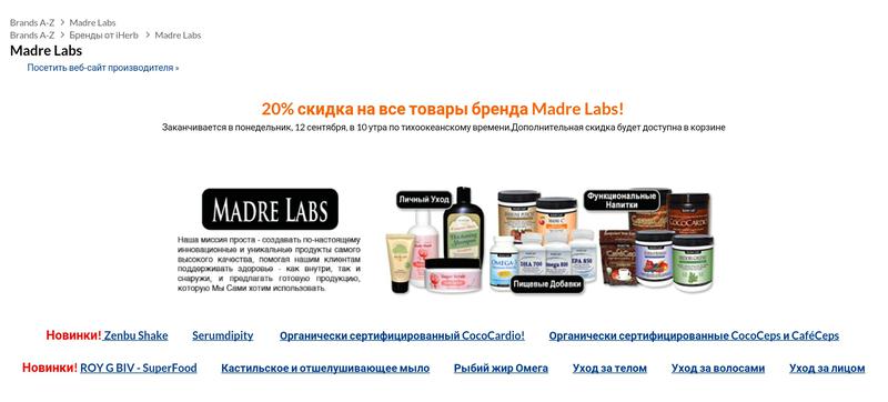 На сайте до 12 сентября скидка 20% на бренд Madre Labs, очень классная фирма. Я брала некоторые товары и они мне очень понравились. У них очень хорошие средства для личного ухода и пищевые добавки. Советую обратить внимание.
