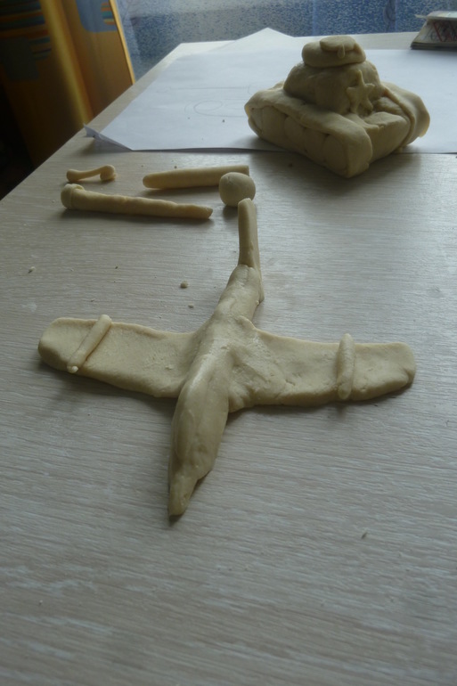 Слепили танк и самолет из теста, а потом раскрасили красками)