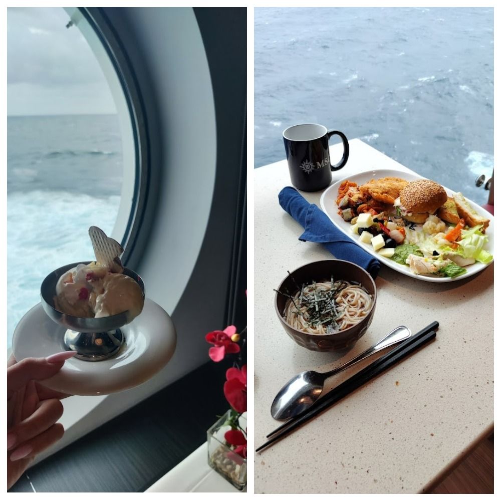 На лайнере была и привычная нам европейская еда: картофель, паста, пицца, сыр, хлеб. И уголок с азиатской едой: рамен, рис, всякие водоросли и ещё что-то непонятное. В основном ресторане меню на русском языке - удобно.