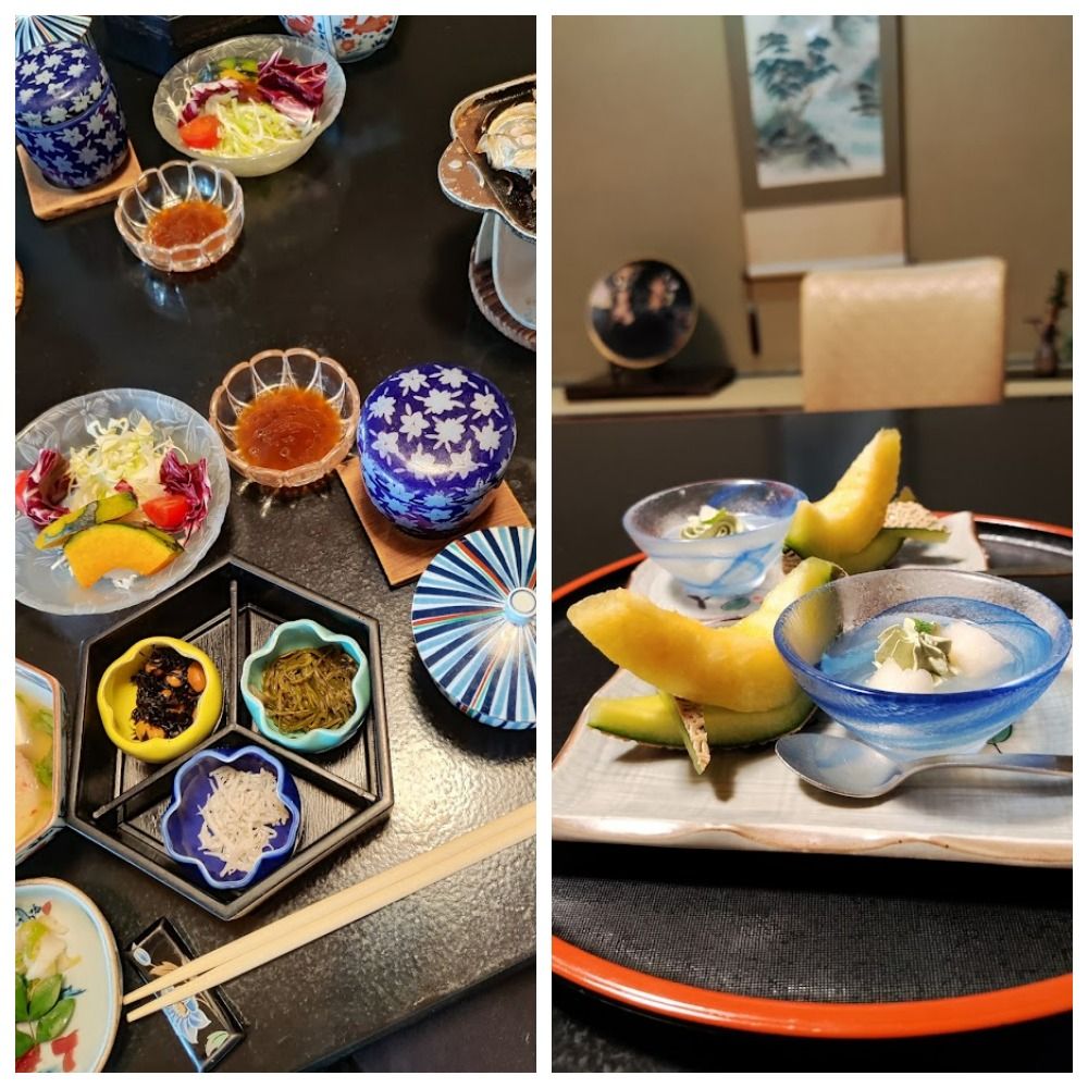 Порции блюд в кафе преимущество огромные. Но когда мы жили в рёкане, у нас был заказан традиционный японский ужин и завтрак. Было много разных блюд в маленьких тарелочках. Феерия вкусов, прям обалдеть как вкусно. И сырая рыба оказалась очень интересной, и морепродукты, и все остальное.